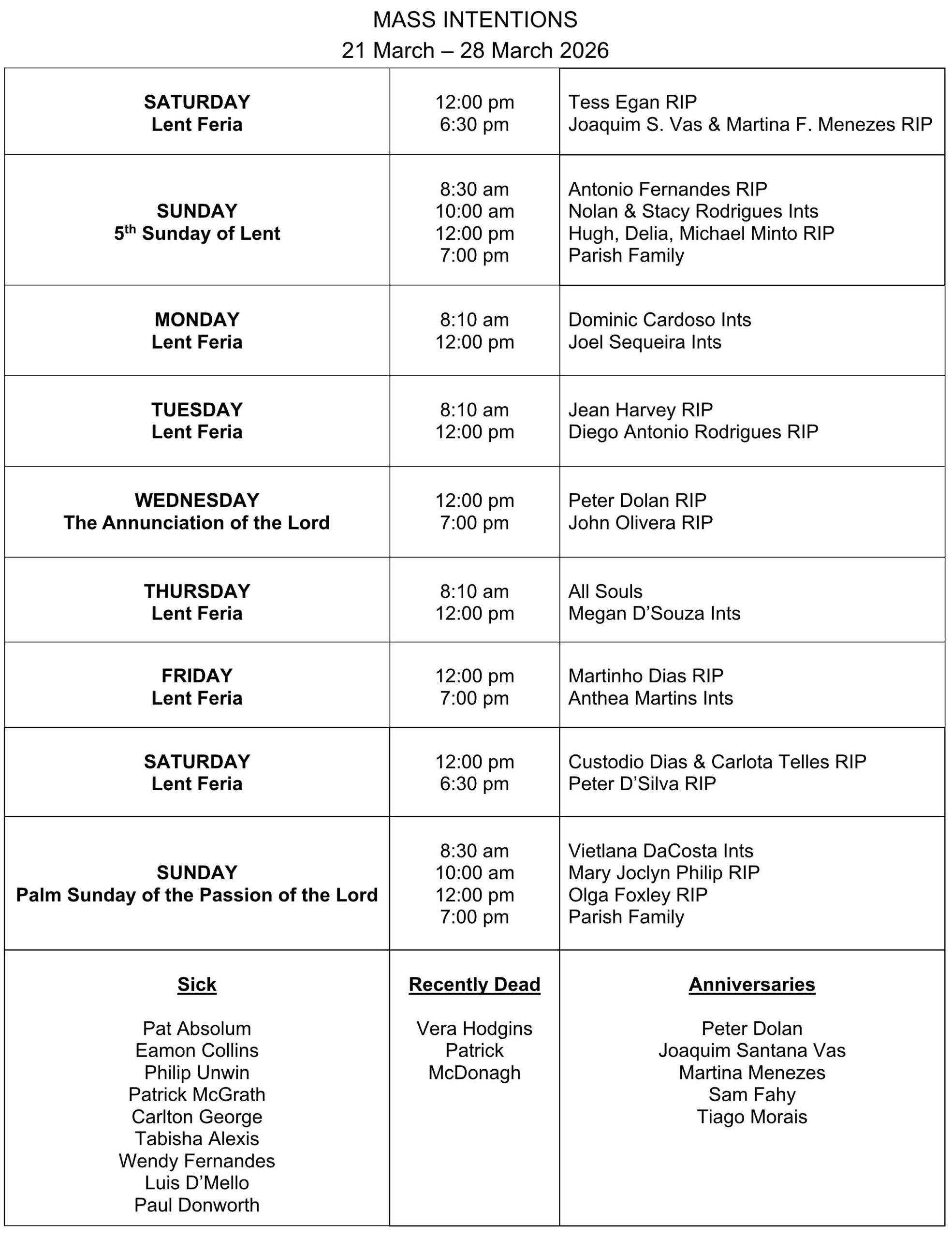 12:00 noon with the Vigil Mass at 6:30 pm on Saturday